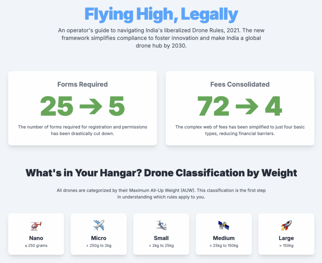 The core tenets of this new regulatory regime are designed to foster growth, innovation, and position India as a “global drone hub by 2030”.5 This is evidenced by a drastic simplification of the compliance framework, including a reduction in the number of required forms from 25 to just five and a consolidation of fee types from 72 to four.2 Numerous complex approvals, such as unique authorization numbers, certificates of manufacturing, and import clearances, have been abolished to lower the barrier to entry for manufacturers, operators, and service providers.4