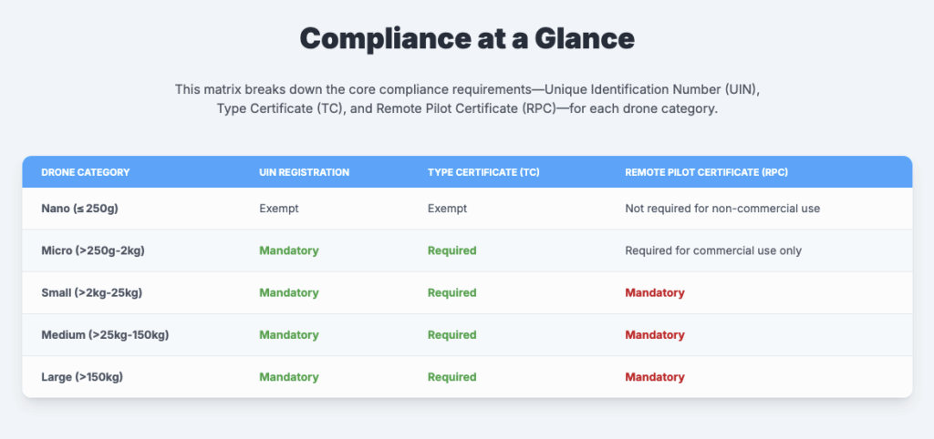 | Drone Category | All-Up Weight (AUW) | UIN Registration | Type Certificate (TC) | Remote Pilot Certificate (RPC) Requirement |