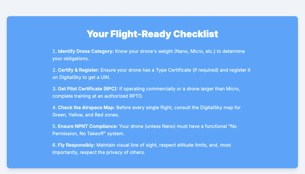 Navigating India’s drone regulations requires a systematic approach to compliance. The liberalized framework is built on trust and self-certification, placing the onus of responsibility squarely on the operator. The following checklist synthesizes the key legal requirements for any individual or entity looking to operate a drone in India.