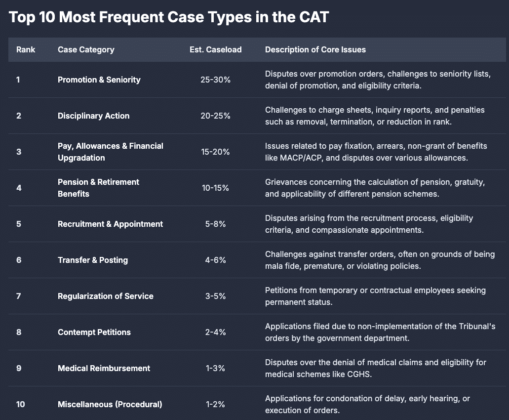 Disputes related to promotion and seniority consistently rank as the most common category before the CAT.8 These cases are driven by the natural and legitimate career aspirations of employees. Litigation typically arises from several key issues: challenges to the correctness of seniority lists, which form the basis for promotion; allegations of being unfairly superseded by junior colleagues; disputes over the interpretation of recruitment and promotion rules; and challenges to the outcomes of Departmental Promotion Committees (DPCs).15 The complexity of service rules, coupled with the high stakes involved in career advancement, makes this a fertile ground for disputes. Each promotion or seniority-related case represents a critical juncture in an employee’s professional life, making them highly likely to seek judicial recourse if they perceive an injustice.
