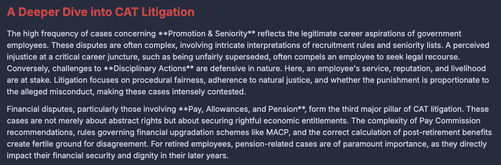 - Litigation in the CAT is dominated by cases on Promotion, Disciplinary Actions, and Pensions, reflecting significant conflict areas.