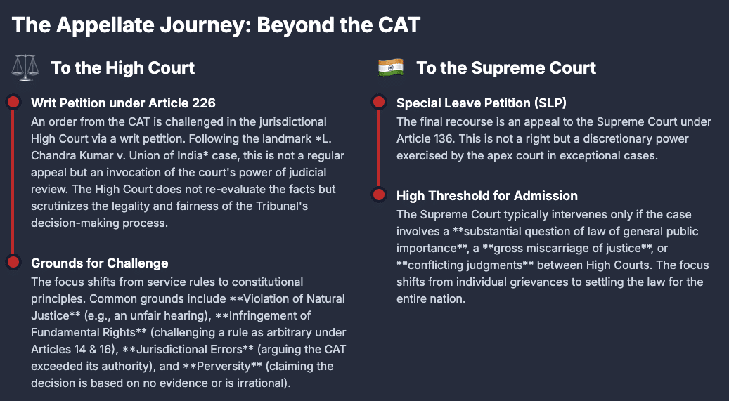 This multi-stage journey, from a fact-centric inquiry at the CAT to a law-centric review at the High Court and a policy-setting adjudication at the Supreme Court, illustrates the sophisticated and hierarchical nature of India’s system for resolving service matters.