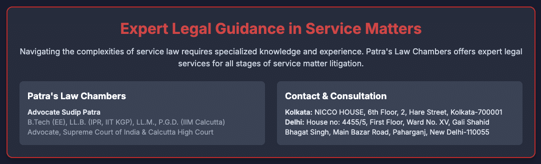 #ServiceLaw #CAT #CentralAdministrativeTribunal #ServiceMatters #IndianLaw #HighCourt #SupremeCourt #WritPetition #SLP #GovernmentJobs #PublicServant #LegalIndia #LawFirm #Advocate #PromotionCase #DisciplinaryAction #Pension #Litigation #PatrasLawChambers #CalcuttaHighCourt