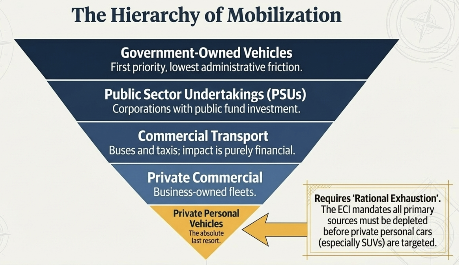 Administrative guidelines issued by the Election Commission of India (ECI) and state transport departments create a clear order of priority for vehicle mobilization. The objective is to minimize disruption to the public transport system and the lives of individual citizens.10