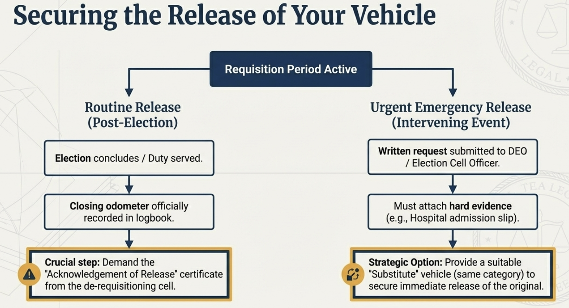 The release of a vehicle can be either routine (after the election is over) or urgent (due to an intervening emergency).