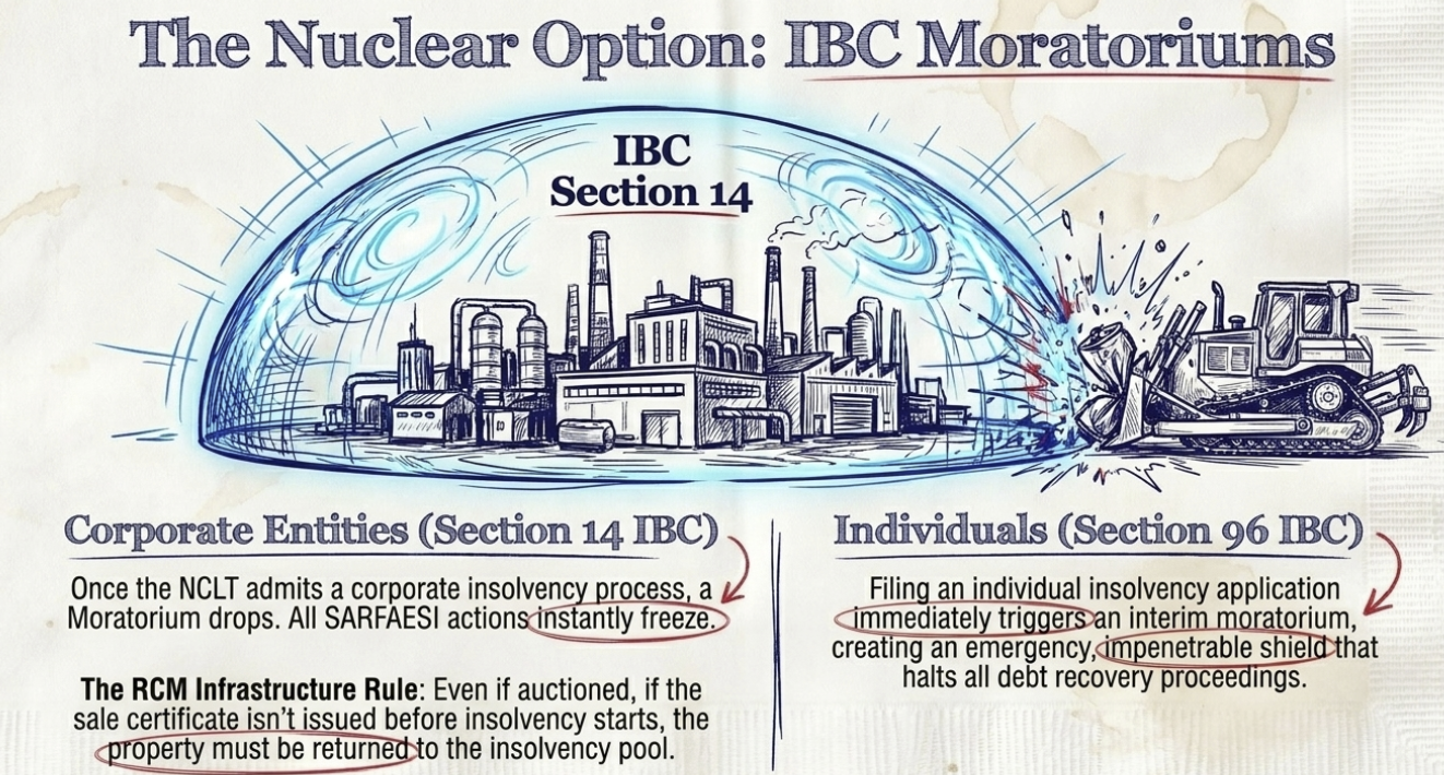 Under Section 14 of the IBC, once a Corporate Insolvency Resolution Process (CIRP) is admitted by the National Company Law Tribunal (NCLT), a “moratorium” is declared.43 This moratorium prohibits any action to recover or enforce any security interest.43 In Indian Overseas Bank v. RCM Infrastructure Ltd., the Supreme Court ruled that even if an auction is conducted, if the sale certificate is not issued before the insolvency commencement date, the sale becomes void and the property must be returned to the insolvency pool.43 For individual borrowers, the filing of an insolvency application under Section 96 triggers an “interim moratorium” that similarly halts all recovery proceedings related to the debt.44