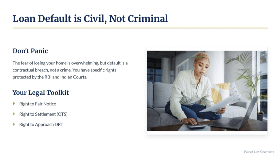 At Patra’s Law Chambers, we believe that financial distress is a civil issue, not a criminal one. This detailed guide will hand you the “Regulatory Toolkit” and “Legal Strategies” you need to pause arbitrary bank actions, buy time for repayment, and save your property.
