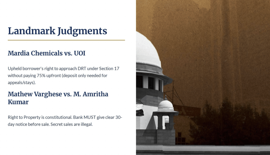 The Ruling: This is the case that upheld the constitutional validity of the SARFAESI Act but struck down the harsh condition that required borrowers to deposit 75% of the debt just to file a case.