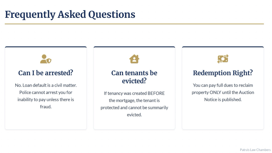 21. Can I pay just the missed EMIs to stop the auction? Legally, the bank can demand full payment. However, the DRT often allows you to pay missed EMIs + penalty to “regularize” the account.