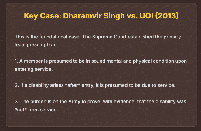 | Dharamvir Singh v. UOI (2013) 7 SCC 316 | Supreme Court | Establishes foundational principles: 1) Presumption of sound health at entry if no disability is noted. 2) Onus of proof is on the employer, not the claimant. 3) A Medical Board’s opinion must be supported by reasons; an unreasoned opinion indicates non-application of mind.1 |