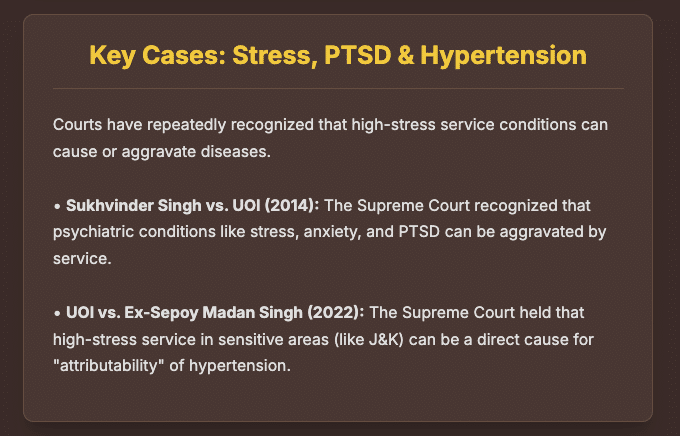 | Bijender Singh v. UOI (2025 INSC 549) | Supreme Court | Reaffirmed that if a disease is not recorded at enrolment, it is presumed to have arisen during service. Held that if a person is invalided out, their disability is assumed to be over 20%.[34, 38] |
