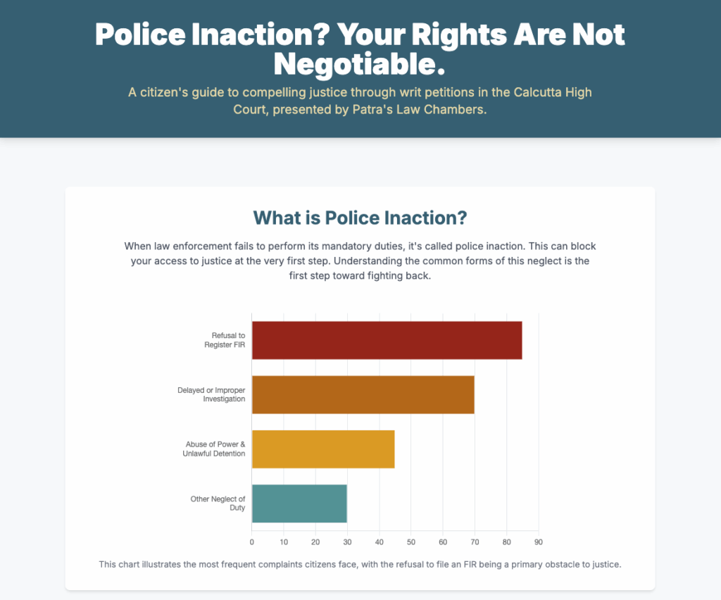 Police inaction writ India writ petition against police inaction Calcutta High Court writ Mandamus writ police inaction FIR not registered remedy delayed police investigation police accountability legal remedies police negligence Article 226 writ constitutional remedies police misconduct Calcutta High Court lawyers Patra's Law Chambers, Advocate Sudip Patra, criminal law Kolkata, civil law Kolkata, intellectual property law, Supreme Court lawyer, High Court lawyer, bail lawyer, quashing FIR, land disputes, family law
