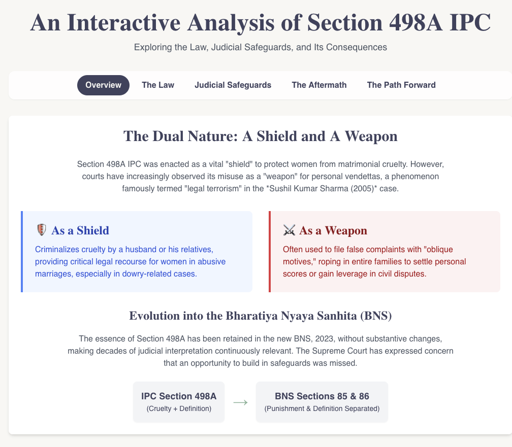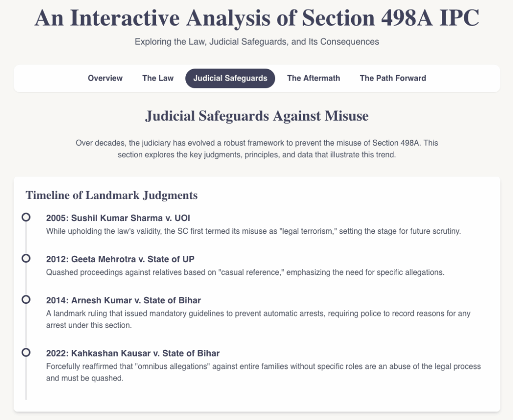 The history of Section 498A’s application is a story of judicial balancing. While its protective intent has never been questioned, the courts have been compelled to evolve a framework of safeguards to counteract its misuse. This evolution reflects a pragmatic response to the ground realities of matrimonial litigation in India.