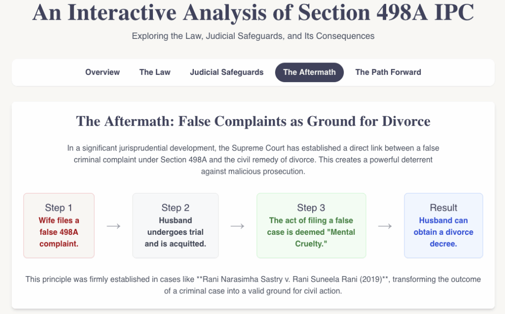 Rani Narasimha Sastry v. Rani Suneela Rani and K. Srinivas Rao v. D.A. Deepa, has established that the very act of a wife filing a false or unsubstantiated Section 498A complaint, which results in the husband’s acquittal after a grueling trial, itself constitutes “mental cruelty” against the husband.28 This allows the husband to successfully seek a divorce on this ground. This judicial feedback loop serves as a powerful check on the misuse of the criminal provision, as a false complaint can now lead directly to the dissolution of the marriage—a consequence the complainant may not have intended.