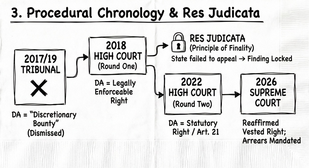 Finality and Res Judicata The State’s failure to appeal the “Round One” judgment (2018) proved fatal. By merely seeking a review (which was dismissed), the State allowed the High Court’s finding—that DA is a legally enforceable right—to attain the status of res judicata. The Principle of Finality precluded the State from later reverting to the “discretionary bounty” argument before the Supreme Court.