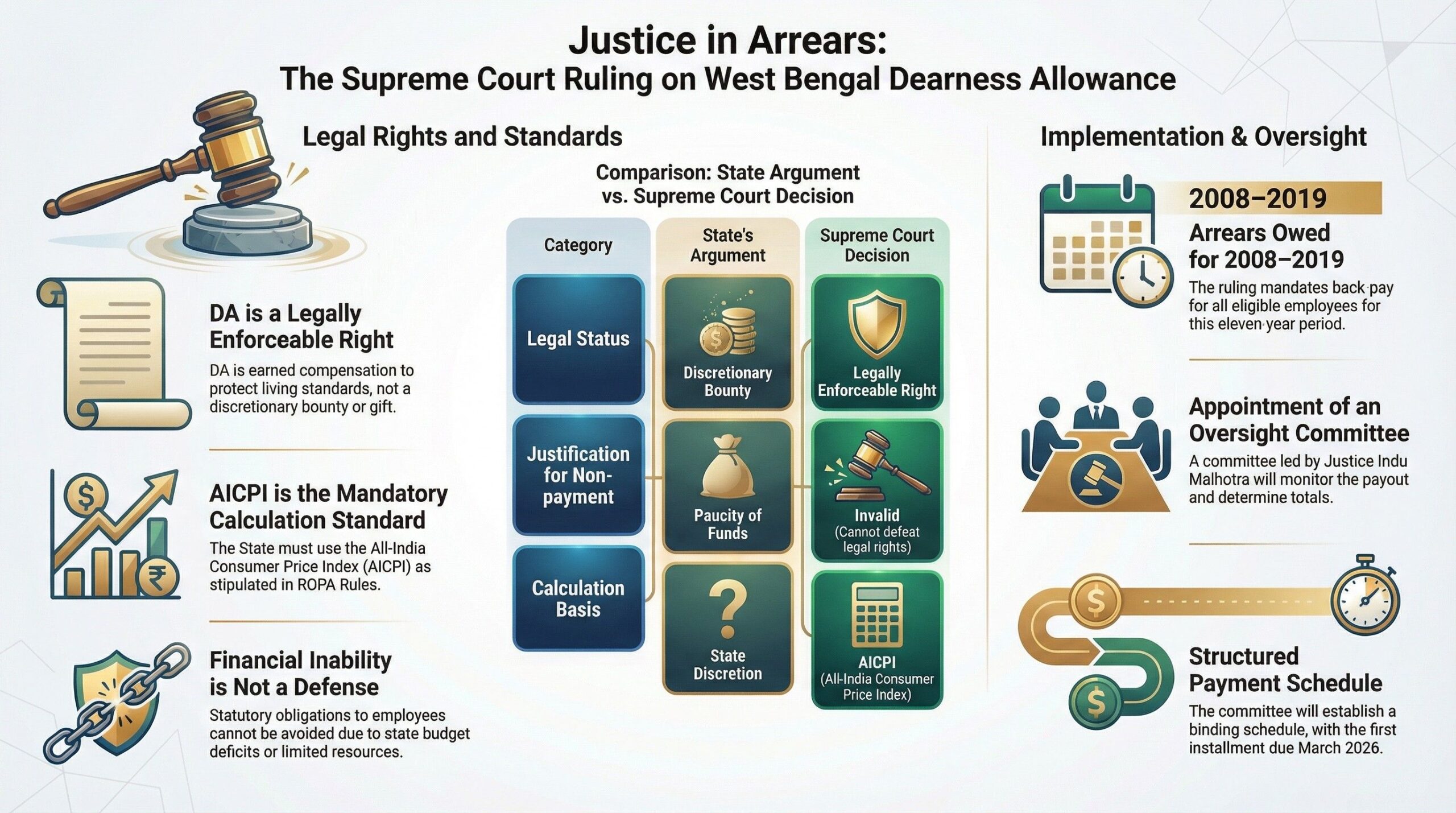 - Arrears for 2008–2019 mandated; retired employees during litigation are entitled to benefits.